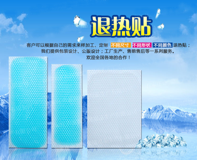【產(chǎn)品加工】客戶可以根據(jù)自己的需求來樣加工,定制不同尺寸、不同形狀、不同顏色的退熱貼;我們提供包裝設(shè)計(jì)、公版設(shè)計(jì);工廠生產(chǎn)、售前售后等一系列服務(wù)。歡迎全國(guó)各地客戶合作!